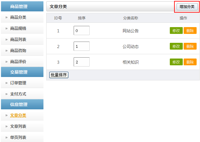 1.點擊“文章分類”可以編輯分類名稱,調(diào)整分類顯示順序,刪除分類,如下圖所示: