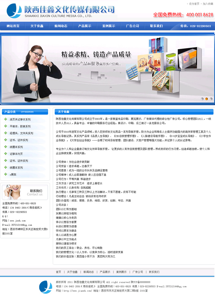 陜西佳鑫文化傳媒有限公司成立于2003年,是一家集宣傳品印刷、展覽展示、廣告媒體代理的綜合性廣告公司。核心管理團(tuán)隊(duì)20人,一線技術(shù)人員16人,具備專業(yè)、豐富的印刷服務(wù)行業(yè)經(jīng)驗(yàn)。